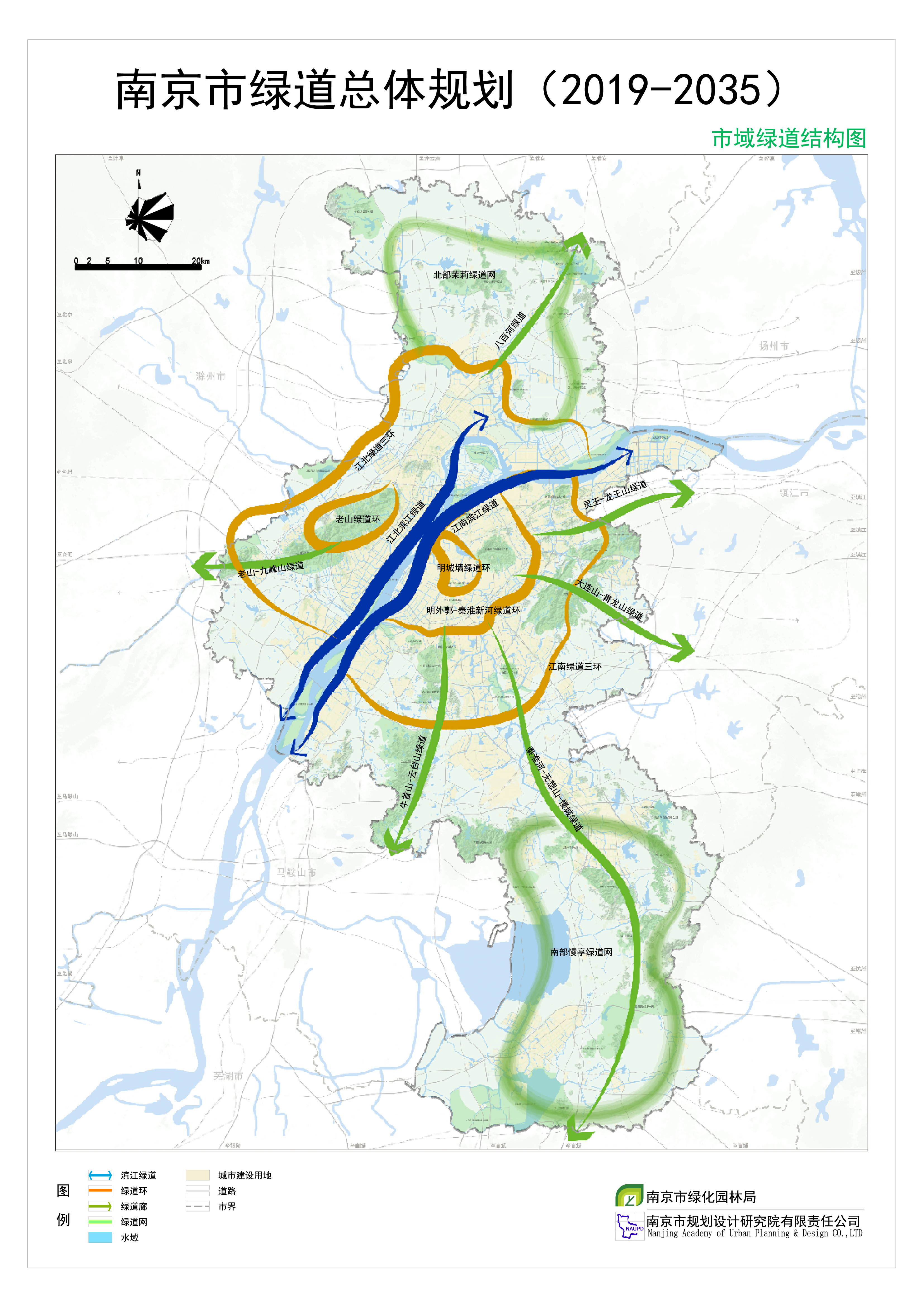 规划充分依托南京山水自然资源和历史文化资源,以江为轴,以河为脉,以墙显胜,以郭定城,以绿连郊,以路串园,在市域形成江南江北相对独立、环带相接、串点连景的两个绿道结构。