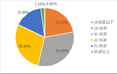 其中18岁及以下的有0人;19-30岁的63人,占受访总人数的22.10%;31-40岁的有90人,占受访总人数的31.60%;41-50岁的有81人,占受访总人数的28.40%;51-60岁的有45人,占受访总人数的15.8%;60岁以上的有6人,占受访总人数的2.10%。