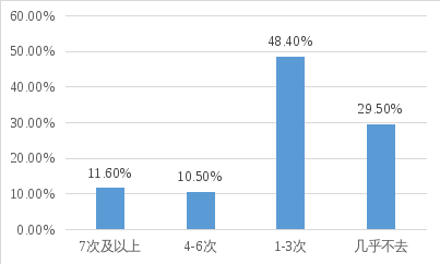 其中7次及以上的有33人,占受访总人数的11.60%;4-6次的30人,占受访总人数的10.50%;1-3次的有138人,占受访总人数的48.40%;几乎不去的有84人,占受访总人数的29.50%。