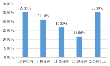 其中5分钟以内的有72人,占受访总人数的25.30%;6-10分钟的60人,占受访总人数的21.10%;11-15分钟的有48人,占受访总人数的16.80%;16-20分钟的有33人,占受访总人数的11.60%;20分钟以上的有72人,占受访总人数的25.30%。