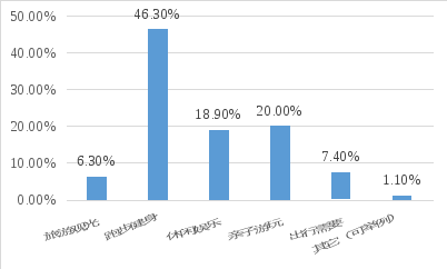 其中旅游观光的有18人,占受访总人数的6.30%;跑步健身的有132人,占受访总人数的46.30%;休闲娱乐的有54人,占受访总人数的18.90%;亲子游玩的57人,占受访总人数的20.00%;出行需要的有21人,占受访总人数的7.40%;有3人,占受访总人数的1.10%。