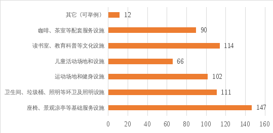 其中“座椅、景观凉亭等基础服务设施”的有147人次,占受访总人数的22.90%;“卫生间、垃圾桶、照明等环卫及照明设施”的有111人次,占受访总人数的17.29%;“运动场地和健身设施”的有102人次,占受访总人数的15.89%;“儿童活动场地和设施”的66人次,占受访总人数的10.28%;“读书室、教育科普等文化设施”的有114人次,占受访总人数的17.76%;“咖啡、茶室等配套服务设施”的有90人次,占受访总人数的14.02%;“其它”的有12人次,占受访总人数的1.87%。