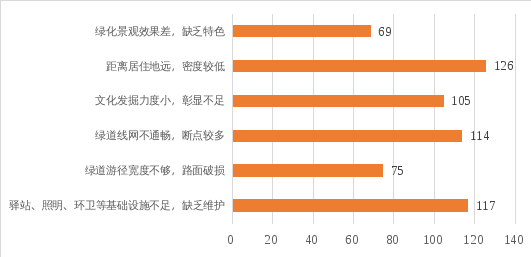 该项受访人数285人,发现现状居住地周边的绿道多数距离居住地较远,密度并不高,且其基础设施不足,缺乏维护。
