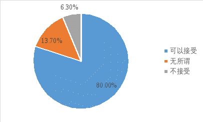 其中可以接受的有228人,占受访总人数的80.00%;无所谓的39人,占受访总人数的13.70%;不接受的有18人,占受访总人数的6.30%。
