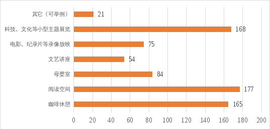 其中“咖啡休憩”的有165人次,占受访总人数的22.18%;“阅读空间”的有177人次,占受访总人数的23.79%;“母婴室”的有84人次,占受访总人数的11.29%;“文艺讲座”的54人次,占受访总人数的7.26%;“电影、纪录片等录像放映”的有75人次,占受访总人数的10.08%;“科技、文化等小型主题展览”的有168人次,占受访总人数的22.58%;“其它”的有21人次,占受访总人数的2.82%。