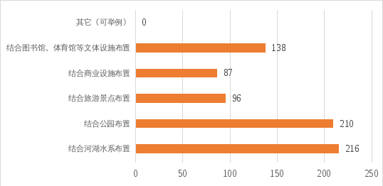 其中“结合河湖水系布置”的有216人次,占受访总人数的28.92%;“结合公园布置”的有210人次,占受访总人数的28.11%;“结合旅游景点布置”的有96人次,占受访总人数的12.85%;“结合商业设施布置”的87人次,占受访总人数的11.65%;“结合图书馆、体育馆等文体设施布置”的有138人次,占受访总人数的18.47%;“其它”的没有。