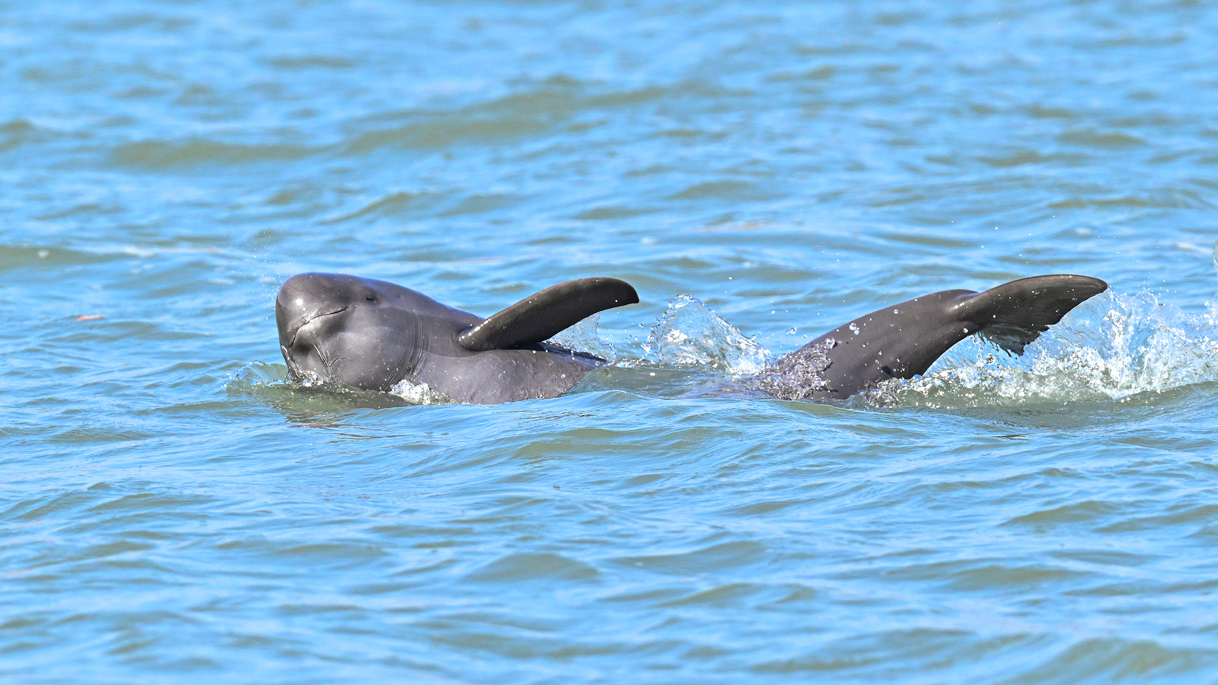 长江江豚还有一种比较少见的“浮窥”行为。浮窥,顾名思义,就是浮出水面窥探,是鲸豚类动物观察周围环境的一种行为。此时江豚的身体基本竖直向上,眼睛甚至身体的一半出水,通过肢体控制,保持片刻与水面的相对静止。此时它们会做出旋转身体、直立移动等动作,以观察水面上的情况,回到水面下后,与其他个体分享和传达水面上的信息。