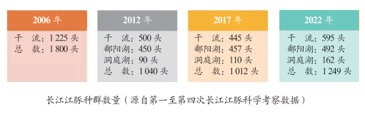 2022年9月起,国家组织了第4次长江全流域江豚科学考察,也是长江十年禁渔政策实施后,首次进行流域性物种系统调查。此次考察取得了令人惊喜的结果:长江江豚种群数量终于回升,达到1249头,与2017年相比,5年间数量增加了23.42%,年均增长率为4.3%,实现了历史性转折,止跌回升。这是自20世纪长江江豚种群数量有科学记录以来,首次实现种群增长。